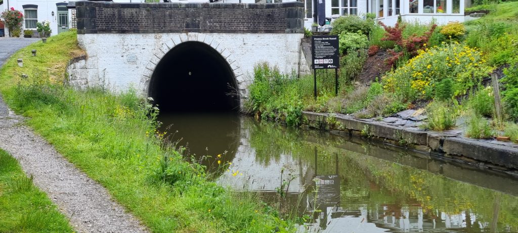 Our stay last night was in a beautiful remote area close to Dutton Locks. It was lovely to start the day walking across fields back towards the Trent and Mersey Canal which we’ve walked on for 5 days. We soon came to the very well known Preston Brook tunnel. We started seeing signs for this over 40 miles ago! The tunnel is over a kilometre long, it is straight and if you look closely at the picture you can see there is literally ‘ light at the end of the tunnel’. We couldn’t walk through it and so had to go over the top along a lush green lane. When we rejoined the canal it became the Bridgewater Canal.