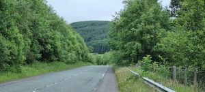 It been a long tough day with lots of ascent. We started back on the road we left yesterday but this time the road was largely through commercial forestry which dominated the views. This road has very few vehicles on but is very noisy as it runs parallel to the motorway and main train line. Our morning break saw our first encounter with the infamous midges. We had wondered when they were going to show up!