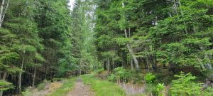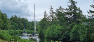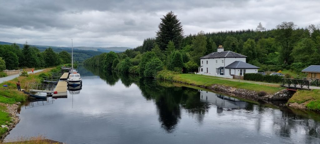 We started with another steep narrow path this morning taking us up to join another woodland track. We travelled past the remainder of Loch Oich on this lovely wide track. After this we once again joined the Caledonian Canal, this time with a fantastic footpath. Unusually the path goes onto a thin strip of land for a few miles with the canal on one side and The River Oich on the other side. It was such fantastic walking, the canal was totally calm with stunning reflections of trees, buildings and boats.